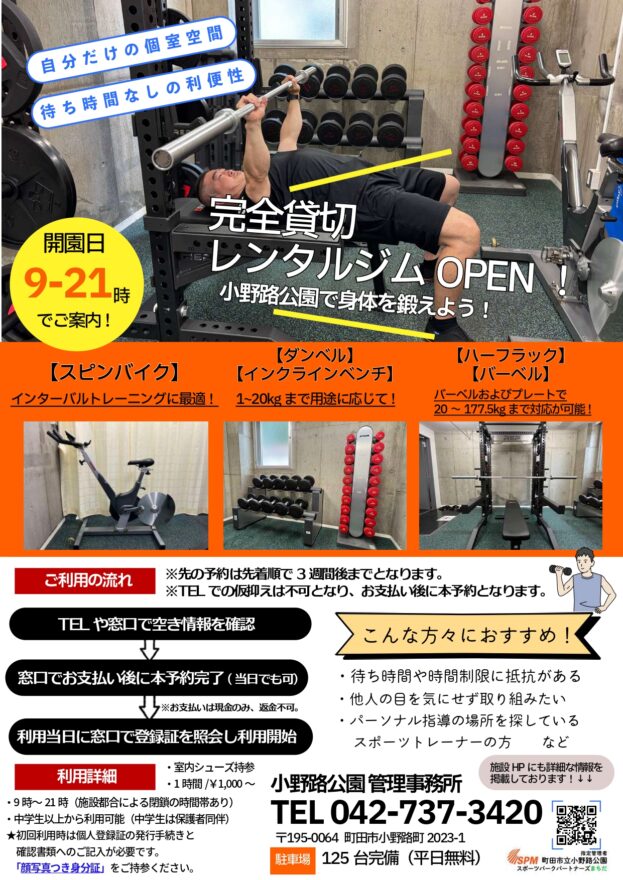小野路公園管理棟内の一角をリニューアルして『完全貸切の個人レンタルジム』をオープンいたしました。